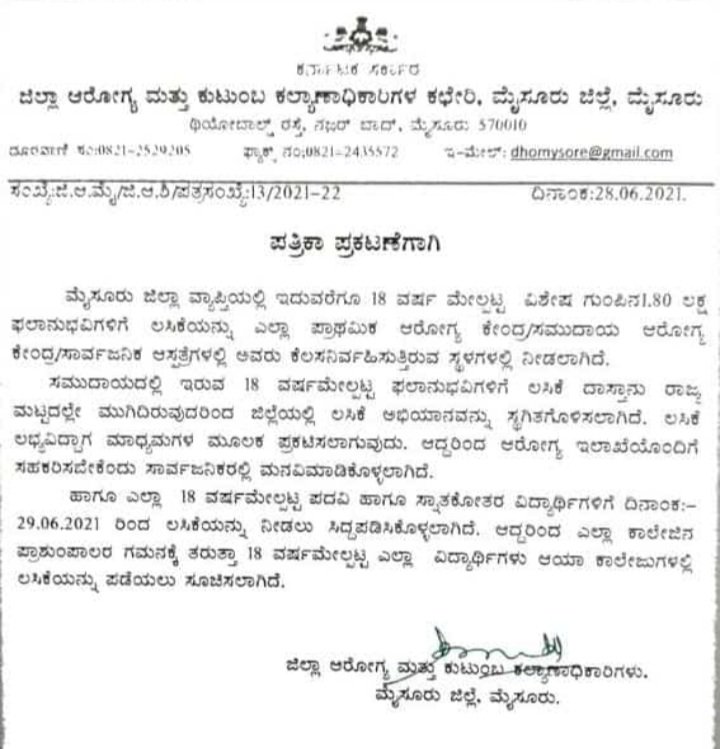 ಮೈಸೂರಿನಲ್ಲಿ ಮತ್ತೆ ಕೊವಿಡ್ ಲಸಿಕೆ ಕೊರತೆ: ಜಿಲ್ಲೆಯಾದ್ಯಂತ ಲಸಿಕಾ ಅಭಿಯಾನ ತಾತ್ಕಾಲಿಕ ಬಂದ್