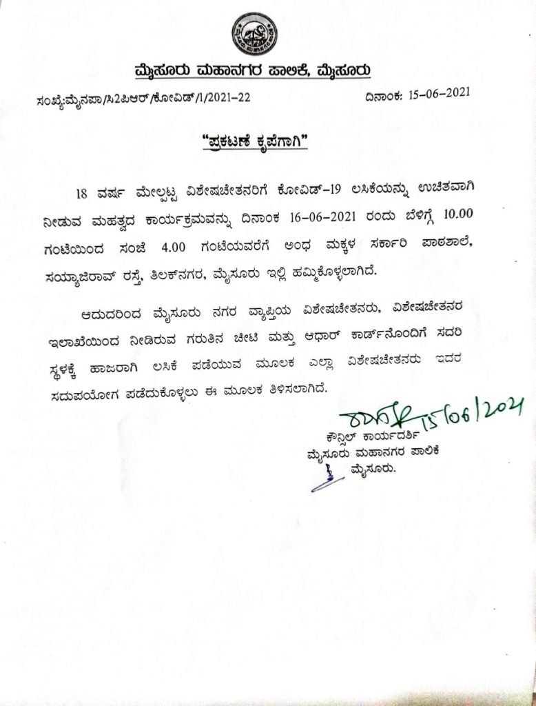 ಮೈಸೂರಿನಲ್ಲಿರುವ ವಿಶೇಷ ಚೇತನರು ಇದರ ಸದುಪಯೋಗಪಡಿಸಿಕೊಳ್ಳಬಹುದಾಗಿದೆ. ಲಸಿಕೆಗೆ ಬರುವ ವಿಶೇಷ ಚೇತನರು, ತಮ್ಮ ಗುರುತಿನ ಚೀಟಿ ಹಾಗೂ ಆಧಾರ್ ಕಾರ್ಡ್ ತರುವಂತೆ ಪಾಲಿಕೆ ಅಧಿಕಾರಿಗಳು ತಿಳಿಸಿದ್ದಾರೆ.