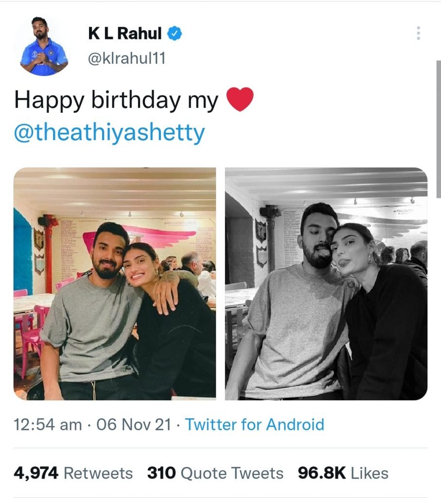 ಸ್ಕಾಟ್ಲೆಂಡ್ ವಿರುದ್ಧ ಭರ್ಜರಿ ಜಯ ಸಾಧಿಸಿದ ಬಳಿಕ ಟ್ವಿಟ್ಟರ್ ಪೋಸ್ಟ್ ಮಾಡಿದ ಕೆ.ಎಲ್.ರಾಹುಲ್ ಅವರು ಮೊದಲ ಬಾರಿಗೆ ತನ್ನ ಪ್ರೀತಿಯ ಬಗ್ಗೆ ಅಧಿಕೃತವಾಗಿ ಹೇಳಿಕೊಂಡಿದ್ದಾರೆ. ” ಹ್ಯಾಪಿ ಬರ್ತ್ ಡೇ ಮೈ ಲವ್ ಆಥಿಯಾ ಶೆಟ್ಟಿ” ಎಂದು ಕೆ.ಎಲ್ ಬರೆದುಕೊಂಡಿದ್ದಾರೆ.