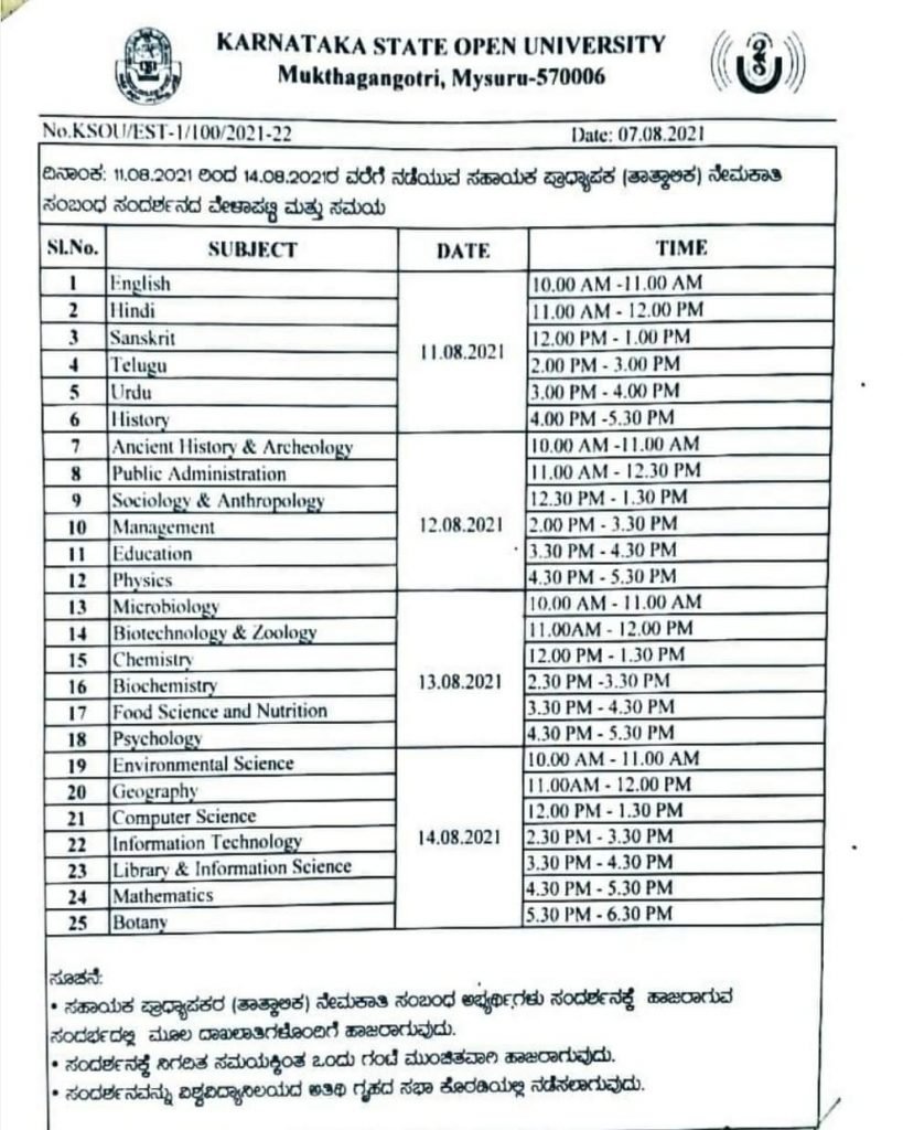 ಆ.11 ರಿಂದ 14 ರ ತನಕ ವಿವಿಧ ವಿಭಾಗಗಳ ಹುದ್ದೆಗೆ ಸಂದರ್ಶನ ನಿಗಧಿಪಡಿಸಿದ ಮುಕ್ತ ವಿವಿ.