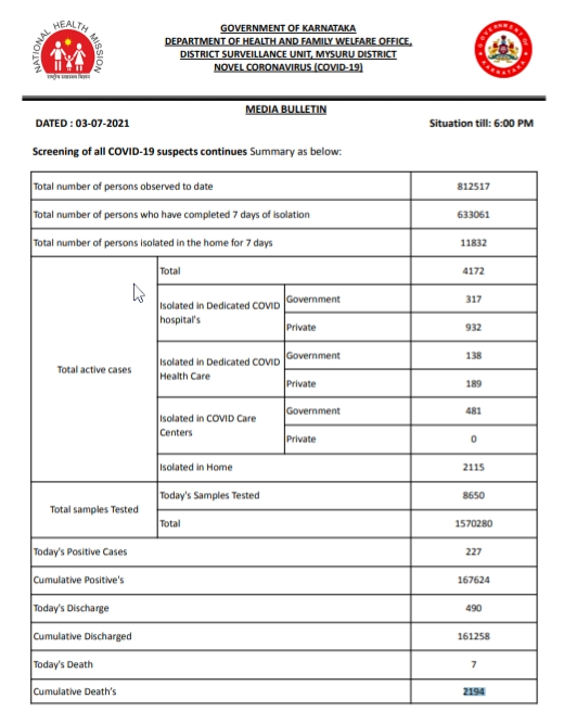 ಮೈಸೂರಿನಲ್ಲಿಂದು 227 ಕೊರೊನಾ ಪಾಸಿಟಿವ್ ಕೇಸ್ ಪತ್ತೆ: 07 ಮಂದಿ ಸಾವು