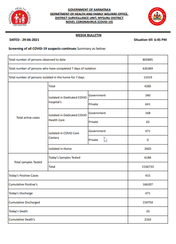 ಮೈಸೂರಿನಲ್ಲಿಂದು 415 ಕೊರೊನಾ ಪಾಸಿಟಿವ್ ಕೇಸ್ ಪತ್ತೆ: 10 ಮಂದಿ ಸಾವು