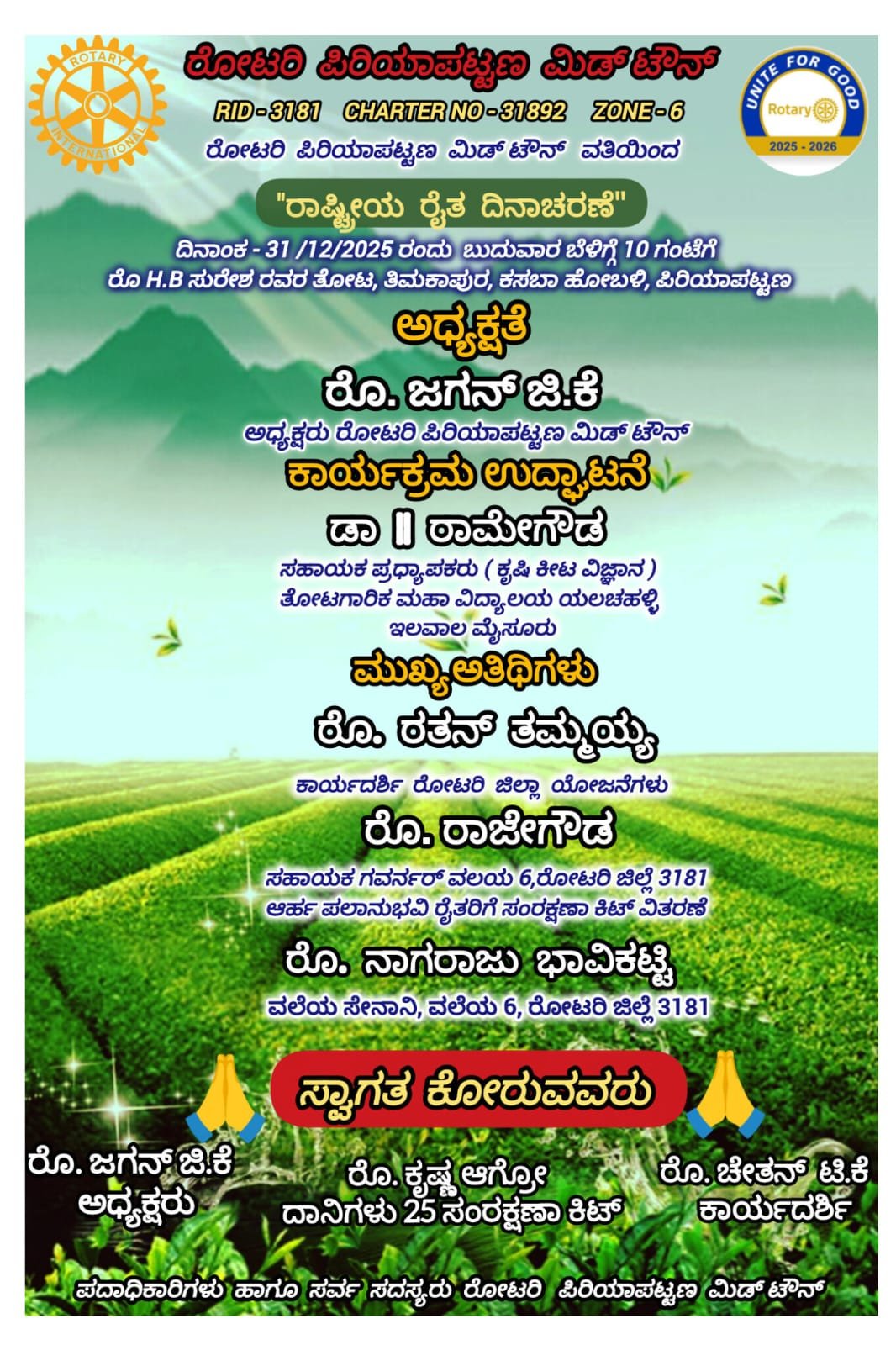 ರೋಟರಿ ಮಿಡ್ ಟೌನ್ ಪಿರಿಯಾಪಟ್ಟಣ ವತಿಯಿಂದ ಡಿ.31ರಂದು ರಾಷ್ಟ್ರೀಯ ರೈತ ದಿನಾಚರಣೆ