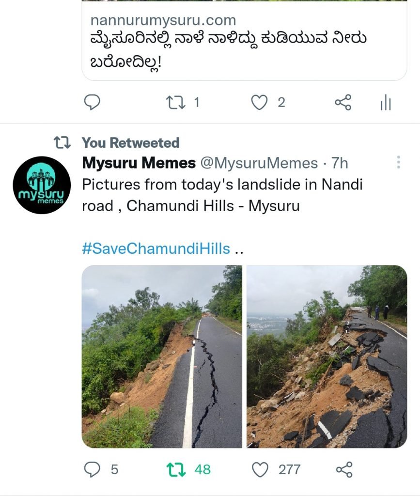 ಚಾಮುಂಡಿ ಬೆಟ್ಟ ಉಳಿಸಿ- ಈ ಅಭಿಯಾನ ಇದೀಗಾ ಸಾಕಷ್ಟು ಚರ್ಚೆ ಹಾಗೂ ದೊಡ್ಡ ಹೋರಾಟವಾಗಿ ಪರಿಣಮಿಸಿದೆ. ಚಾಮುಂಡಿ ಬೆಟ್ಟದ ನಂದಿ ಮಾರ್ಗ ಕುಸಿತ ಕಂಡಿದ್ದೆ ತಡ ಕಾಮಗಾರಿ ಮುಗಿದ ಒಂದು ವರ್ಷ ಆಗದಿದ್ರು ರಸ್ತೆ ಕುಸಿದಿದ್ದು ಸಾಕಷ್ಟು ಆಶ್ಚರ್ಯ ಹಾಗೂ ಅವೈಜ್ಞಾನಿಕ ಕಾಮಗಾರಿ ಎಂದು ಆಕ್ರೋಶ ಕೇಳಿ ಬಂದಿತ್ತು.