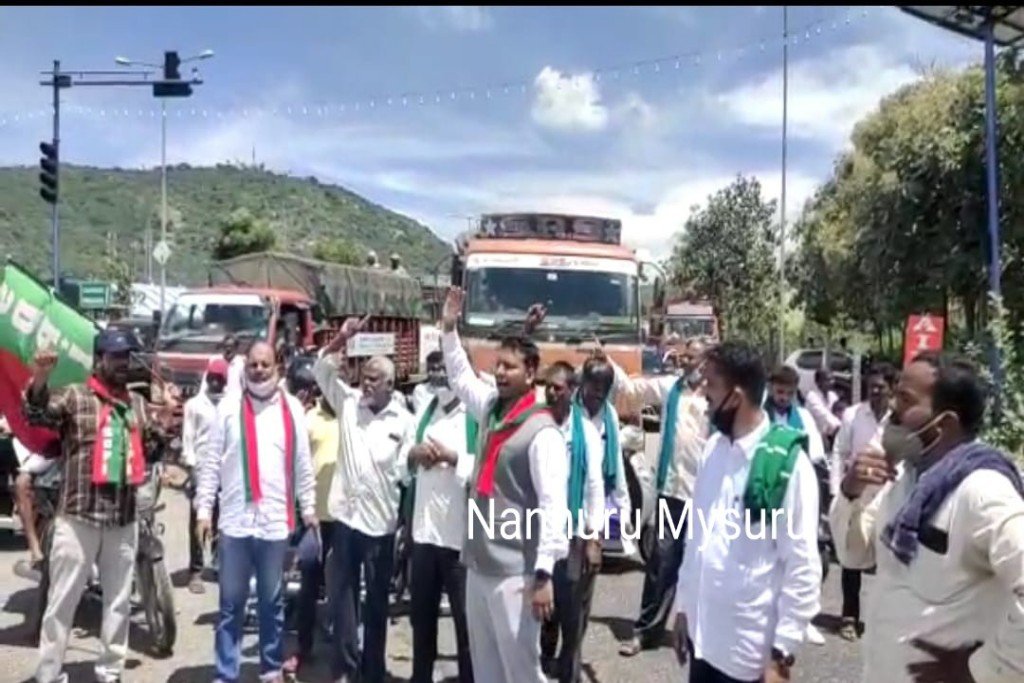 ಮೈಸೂರು-ನಂಜನಗೂಡು ರಸ್ತೆಯಲ್ಲಿರುವ ಎಪಿಎಂಸಿ ಜಂಕ್ಷನ್ ನಲ್ಲಿ ಜಮಾಯಿಸಿದ ರೈತರು ಪ್ರತಿಭಟನೆ ನಡೆಸಿ ಕೇಂದ್ರ ಸರ್ಕಾರದ ವಿರುದ್ಧ ಘೋಷಣೆ ಕೂಗಿ ಆಕ್ರೋಶ ವ್ಯಕ್ತಪಡಿಸಿದರು.